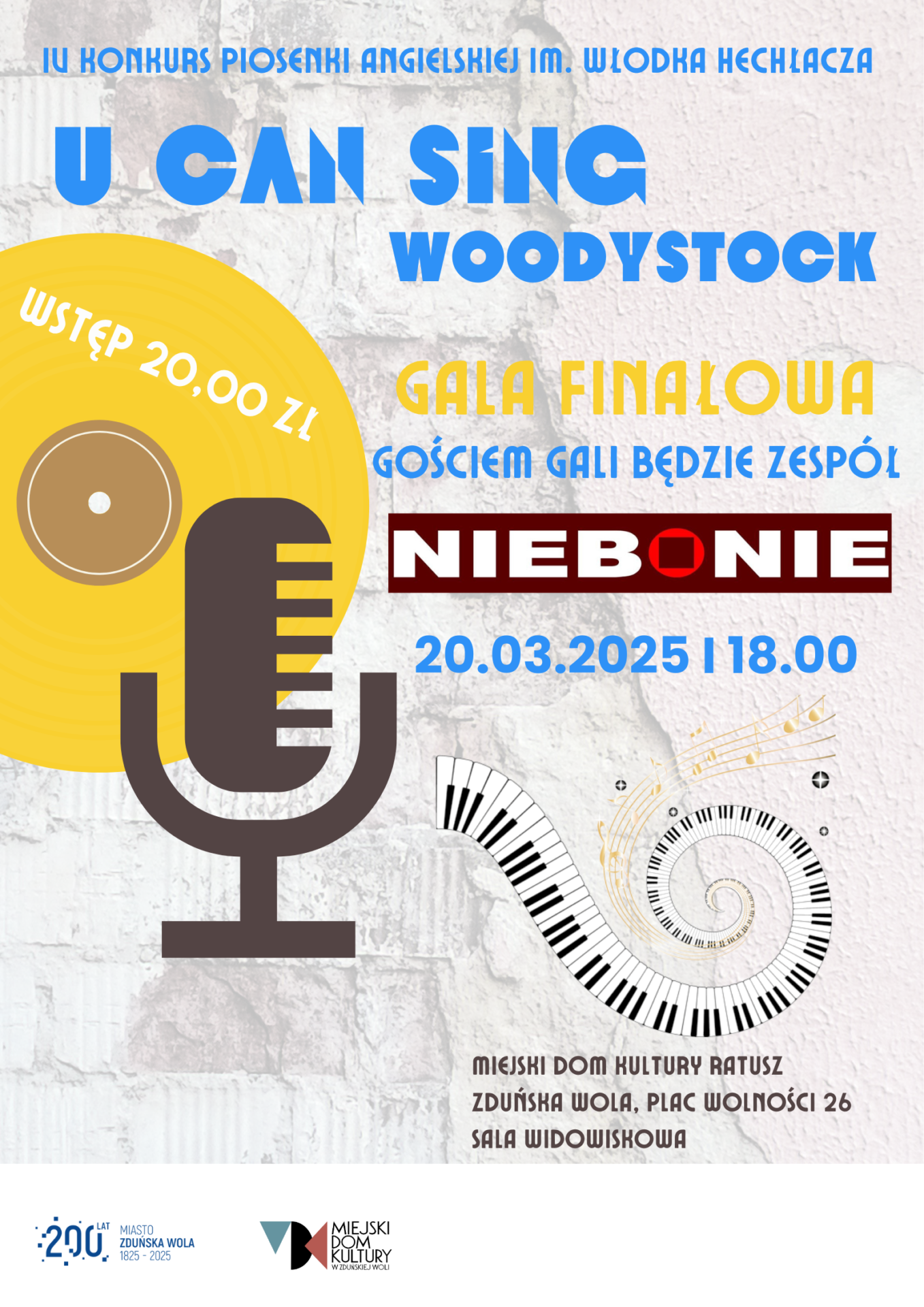W czwartek, 20 marca 2025 roku o godz. 18 rozpocznie się koncert finałowy IV Konkursu Piosenki Angielskiej im. Włodka Hechłacza „U Can Sing – Woodystock”. Bilety na to wydarzenie są dostępne w Miejskiem Domu Kultury Ratusz w Zduńskiej Woli.